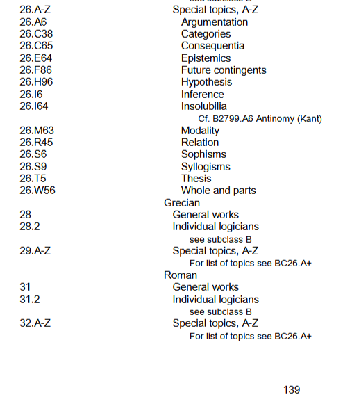 So the way this works is that you figure out what your book is about (Grecian logic, for example) and then you find the section in the pdf that tells you what to do with it (28.2). Where thinks get tricky is when your subject is something like "Insanity" which I picked because it's not on the list above "Grecian." Alphabetically, "Insanity" comes between "Inference" and "Insolubilia", so you'd give it a number after 26 .I6 but before 26 .I64. And that's where things get weird. If I'm Head Cataloger and I decide "Insanity" is 26 .I63, then every book about insanity should be cataloged as a 26 .I63. But if my Associate Head Cataloger doesn't get the memo and makes "Insanity" 26 .I62, the library is now inconsistent. Error.